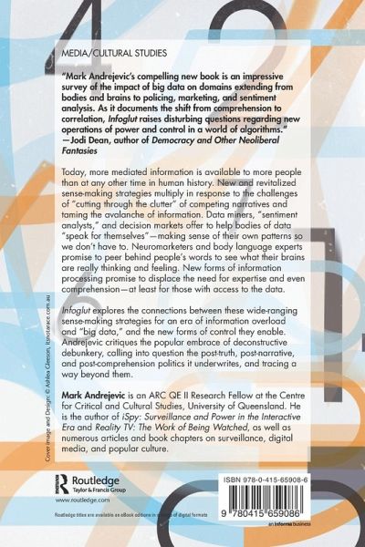 Today, more mediated information is available to more people than at any other time in human history. New and revitalized sense-making strategies multiply in response to the challenges of "cutting through the clutter" of competing narratives and taming the avalanche of information. Data miners, "sentiment analysts," and decision markets offer to help bodies of data "speak for themselves"-making sense of their own patterns so we don't have to. Neuromarketers and body language experts promise to peer behind people's words to see what their brains are really thinking and feeling. New forms of information processing promise to displace the need for expertise and even comprehension-at least for those with access to the data. Infoglut explores the connections between these wide-ranging sense-making strategies for an era of information overload and "big data," and the new forms of control they enable. Andrejevic critiques the popular embrace of deconstructive debunkery, calling into question the post-truth, post-narrative, and post-comprehension politics it underwrites, and tracing a way beyond them.