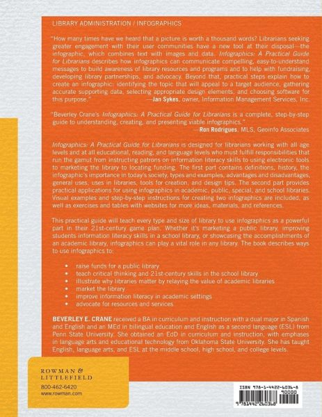 Infographics: A Practical Guide for Librarians is designed for librarians who work with all age levels from youngsters to seniors at all educational, reading and language backgrounds, who must fulfill responsibilities that run the gamut from instructing patrons on information literacy skills to using electronic tools to marketing the library to locating funding, It includes basics about infographics followed by practical applications important for librarians. Visual examples serve as instructional models and exercises reinforce learning.
