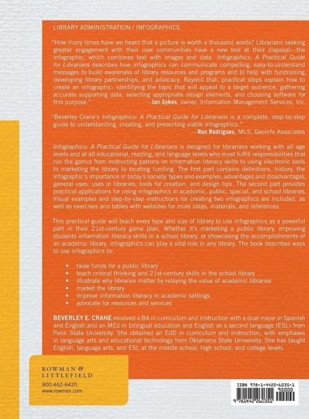 Infographics: A Practical Guide for Librarians is designed for librarians who work with all age levels from youngsters to seniors at all educational, reading and language backgrounds, who must fulfill responsibilities that run the gamut from instructing patrons on information literacy skills to using electronic tools to marketing the library to locating funding, It includes basics about infographics followed by practical applications important for librarians. Visual examples serve as instructional models and exercises reinforce learning.