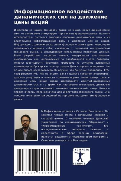 Inwestory na nashem fondowom rynke ne znaüt, kakie dinamicheskie sily na samom dele stimuliruüt torgowlü na fondowom rynke. Poätomu issledowatel' pytaetsq wyqsnit' osnownye dinamicheskie sily i ih wliqtel'nuü informacionnuü rol' w dwizhenii cen na akcii. Informaciq o dinamicheskih silah fondowogo rynka daet inwestoram wozmozhnost' ocenit' sebq, swqzannuü s torgowlej instrumentami fondowogo rynka. V issledowanii ispol'zowany perwichnye dannye. Byla razrabotana zakrytaq anketa, soderzhaschaq shestnadcat' dinamicheskih sil, oceniwaemyh po pqtiball'noj shkale Lajkerta. Otwety shestidesqti birzhewyh trejderow iz sluchajno wybrannyh wosemnadcati brokerskih kontor goroda Dakka horosho produmany. Na osnowe oprosa issledowatel' obnaruzhil, chto bonusnye diwidendy, EPS, koäfficient P/E, NAV na akciü, data godowogo sobraniq akcionerow, delowaq reputaciq i nowosti kompanii igraüt znachitel'nuü rol' w dwizhenii ceny akcij sredi shestnadcati identificirowannyh dinamicheskih sil, w to wremq kak nastroeniq inwestorow, denezhnye diwidendy i sluhi okazywaüt naimenee znachitel'nyj stimul. Kniga w perwuü ochered' prednaznachena dlq inwestorow fondowogo rynka. Ona pomozhet im w prinqtii reshenij po torgowle instrumentami fondowogo rynka.