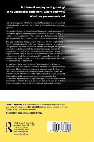 Re-Placing Informal Employment challenges many of the popular myths surrounding informal economic activities, and offers a radical reassesment of their extent, growth, location and nature. The book uses case studies from the UK, France, Italy, the Netherlands, the US and Canada to challenge: * the popular belief that informal employment is growing throughout the advanced economies * the myth that this work is undertaken mostly by marginalized groups * the dominant view that we should replace informal with formal employment through enforcement of regulations. Examining policy options and their consequences, the authors show that conventional approaches only increase inequalities and that a radical alternative solution is essential.