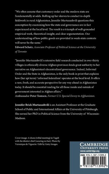 Despite vast efforts to build the state, profound political order in rural Afghanistan is maintained by self-governing, customary organizations. Informal Order and the State in Afghanistan explores the rules governing these organizations to explain why they can provide public goods. Instead of withering during decades of conflict, customary authority adapted to become more responsive and deliberative. Drawing on hundreds of interviews and observations from dozens of villages across Afghanistan, and statistical analysis of nationally representative surveys, Jennifer Brick Murtazashvili demonstrates that such authority enhances citizen support for democracy, enabling the rule of law by providing citizens with a bulwark of defence against predatory state officials. Contrary to conventional wisdom, it shows that 'traditional' order does not impede the development of the state because even the most independent-minded communities see a need for a central government - but question its effectiveness when it attempts to rule them directly and without substantive consultation.
