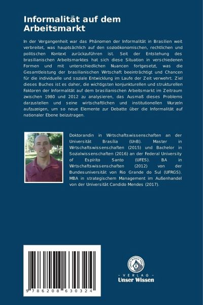 In der Vergangenheit war das Phänomen der Informalität in Brasilien weit verbreitet, was hauptsächlich auf den sozioökonomischen, rechtlichen und politischen Kontext zurückzuführen ist. Seit der Entstehung des brasilianischen Arbeitsmarktes hat sich diese Situation in verschiedenen Formen und mit unterschiedlichen Nuancen fortgesetzt, was die Gesamtleistung der brasilianischen Wirtschaft beeinträchtigt und Chancen für die individuelle und soziale Entwicklung im Laufe der Zeit verwehrt. Ziel dieses Buches ist es daher, die wichtigsten konjunkturellen und strukturellen Faktoren der Informalität auf dem brasilianischen Arbeitsmarkt im Zeitraum zwischen 1980 und 2012 zu analysieren, das Ausmaß dieses Problems darzustellen und seine wirtschaftlichen und institutionellen Wurzeln aufzuzeigen, um so neue Elemente zur Debatte über die Informalität auf nationaler Ebene beizutragen.