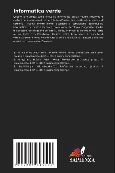 Questo libro spiega come l'industria informatica possa ridurre l'impronta di carbonio e la percentuale di contributo all'ambiente rispetto alle emissioni di carbonio. Illustra inoltre come scegliere i componenti dell'industria informatica che contribuiscono a promuovere l'ecologia. Suggerisce inoltre di spostare l'archiviazione dei dati su cloud, in modo da ridurre in una certa misura l'utilizzo dell'hardware. Illustra inoltre brevemente il concetto di virtualizzazione. Il testo include casi di studio relativi a vari settori e alle loro attività per promuovere l'ecologia.