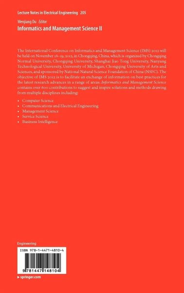 The International Conference on Informatics and Management Science (IMS) 2012 will be held on November 16-19, 2012, in Chongqing, China, which is organized by Chongqing Normal University, Chongqing University, Shanghai Jiao Tong University, Nanyang Technological University, University of Michigan, Chongqing University of Arts and Sciences, and sponsored by National Natural Science Foundation of China (NSFC). The objective of IMS 2012 is to facilitate an exchange of information on best practices for the latest research advances in a range of areas. Informatics and Management Science contains…mehr