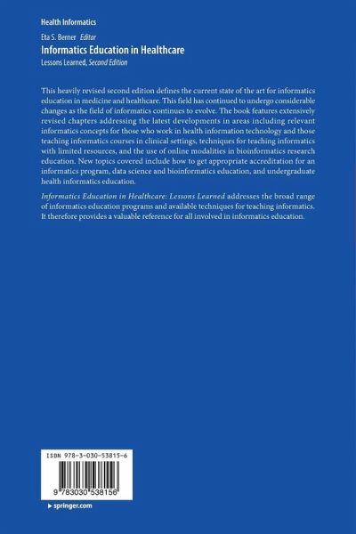 This heavily revised second edition defines the current state of the art for informatics education in medicine and healthcare. This field has continued to undergo considerable changes as the field of informatics continues to evolve. The book features extensively revised chapters addressing the latest developments in areas including relevant informatics concepts for those who work in health information technology and those teaching informatics courses in clinical settings, techniques for teaching informatics with limited resources, and the use of online modalities in bioinformatics research education. New topics covered include how to get appropriate accreditation for an informatics program, data science and bioinformatics education, and undergraduate health informatics education.
