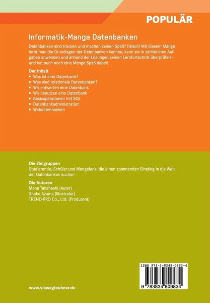 Datenbanken sind von entscheidender Bedeutung für computerbasierte Geschäftssysteme. Einige Leser ziehen die Einbindung einer Datenbank in ihr System vielleicht gerade in Erwägung. Andere entwickeln gerade solch ein Geschäftssystem. Datenbanken unterstützen solche Systeme im Verborgenen, und sie sind nicht ganz einfach zu verstehen. Dieses Buch soll es den Lesern ermöglichen, sich Wissen über Datenbanken mithilfe eines Mangas anzueignen. Am Ende jedes Kapitels sind einige praktische Übungen zu finden, die dabei helfen, das Gelernte zu verstehen und anzuwenden. Diese Übungen sind vor allem für angehende IT-Ingenieure hilfreich. Jedes Kapitel ist so aufgebaut, dass die Leser nicht nur Wissen über Datenbanktechnologien erwerben, sondern auch überprüfen können, welche Inhalte sie verstanden haben. Das Buch ist wie folgt aufgebaut: Kapitel 1 beschreibt die Notwendigkeit einer Datenbank. Warum ist eine Datenbank notwendig? Welche Probleme können entstehen, wenn man keine Datenbank einsetzt? Es wird vermittelt, welche Umgebung für den Einsatz einer Datenbank erforderlich ist. Kapitel 2 stellt die grundlegenden Begriffe einer Datenbank vor. Dabei lernen wir auch Begriffe kennen, die im Zusammenhang mit Datenbanken nicht so bekannt sind. In Kapitel 3 wird der Entwurf einer Datenbank beschrieben. Genauer gesagt schauen wir uns an, wie eine relationale Datenbank derzeit aussieht. In Kapitel 4 lernen wir die Datenbanksprache SQL zur Verwaltung einer relationalen Datenbank kennen. Der Einsatz von SQL erlaubt es, Daten in einer Datenbank ohne Probleme zu handhaben.