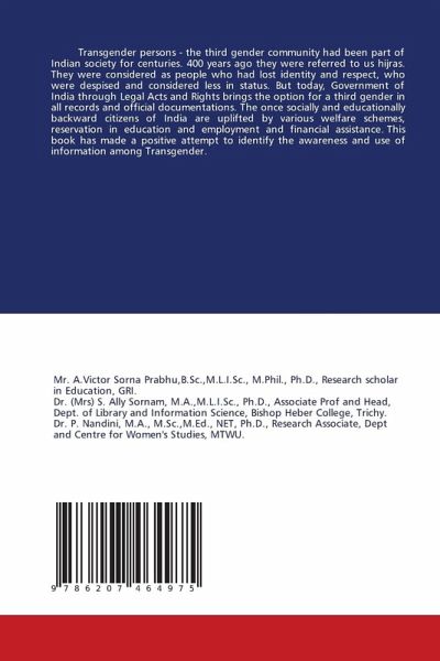 Transgender persons - the third gender community had been part of Indian society for centuries. 400 years ago they were referred to us hijras. They were considered as people who had lost identity and respect, who were despised and considered less in status. But today, Government of India through Legal Acts and Rights brings the option for a third gender in all records and official documentations. The once socially and educationally backward citizens of India are uplifted by various welfare schemes, reservation in education and employment and financial assistance. This book has made a positive attempt to identify the awareness and use of information among Transgender.