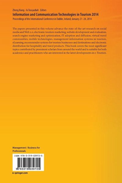 Mobile Technologies and Context-Aware Systems.- Social Media Marketing Strategies.- Emotion and Sentiment Analyses.- Social Network and Interaction.- Online Reviews.- ICT and Travellers' Behaviour.- Gaming, Gamification and Smart Tourism.- Website Evaluation.- ICT Adoption.- eLearning.- Distribution and Decision Support Systems.