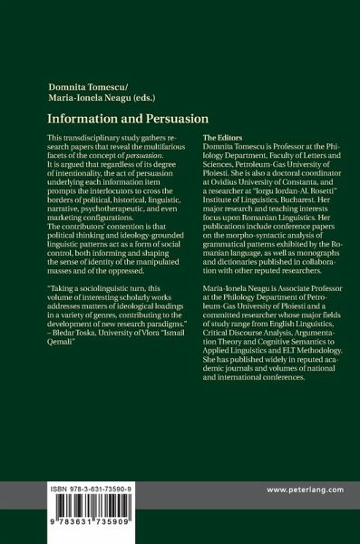 This transdisciplinary study gathers research papers that reveal the multifarious facets of the concept of «persuasion». It is argued that regardless of its degree of intentionality, the act of persuasion underlying each information item prompts the interlocutors to cross the borders of political, historical, linguistic, narrative, psychotherapeutic, and even marketing configurations. The contributors' contention is that political thinking and ideology-grounded linguistic patterns act as a form of social control, both informing and shaping the sense of identity of the manipulated masses and of the oppressed.