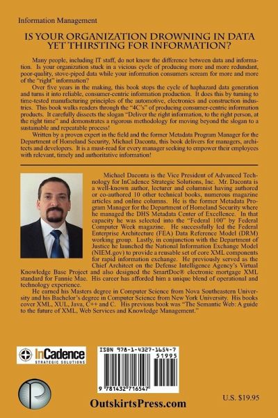 Is your organization drowning in data yet thirsting for information? Many people, including IT staff, do not know the difference between data and information. Is your organization stuck in a vicious cycle of producing more and more redundant, poor-quality, stove-piped data while your information consumers scream for more and more of the right information? Over five years in the making, this book stops the cycle of haphazard data generation and turns it into reliable, consumer-centric information production. It does this by turning to time-tested manufacturing principles of the automotive, electronics and construction industries. This book walks readers through the 4Cs of producing consumer-centric information products. It carefully dissects the slogan Deliver the right information, to the right person, at the right time and demonstrates a rigorous methodology for moving beyond the slogan to a sustainable and repeatable process! Written by a proven expert in the field and the former Metadata Program Manager for the Department of Homeland Security, Michael Daconta, this book delivers for managers, architects and developers. It is a must-read for every manager seeking to empower their employees with relevant, timely and authoritative information!