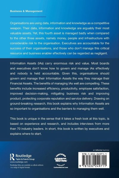 Organisations are using data, information and knowledge as a competitive weapon. Their data, information and knowledge are arguably their most valuable assets. Yet, this fourth asset is managed badly when compared to the other three assets, namely money, people and infrastructure with considerable risk to the organisation. Executives are accountable for the success of their organisations, and those who don't manage this critical resource and business enabler effectively can be regarded as negligent. Information Assets carry enormous risk and value. Most boards and executives don't know how to govern and manage IAs effectively and nobody is held accountable. Given this, organisations should govern and manage their Information Assets the way they manage their Financial Assets. The benefits of managing IAs well are compelling. These benefits include increased efficiency, productivity, employee satisfaction, improved decision-making, mitigating business risk and improving product, protecting corporate reputation and service delivery. Drawing on ground-breaking research, this book explains why Information Assets are so important to organisations and the barriers to managing them well.