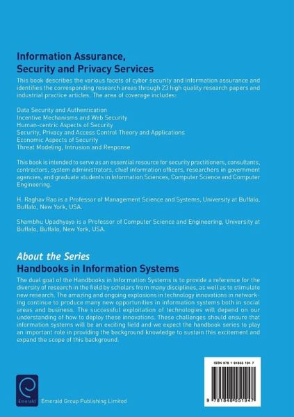 The dual goal of the "Handbook in Information Systems" is to provide a reference for the diversity of research in the field by scholars from many disciplines, as well as to stimulate new research. This volume, focusing on Information Assurance, Security and Privacy Services, consists of six sections. In the first part contributors discuss Program Security, Data Security and Authentication, while the second section covers Internet Scourges and Web Security. Parts two and three concentrate on Usable Security and Human-Centric Aspects, along with Security, Privacy and Access Control whereas the final sections of the book examine Economic Aspects of Security, and Threat Modeling, Intrusion and Response.