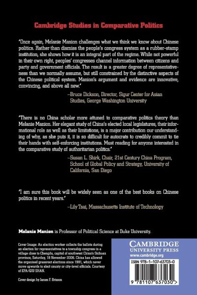 This book investigates the new representation unfolding in Chinese local congresses. Drawing qualitative fieldwork and data analysis from original surveys of 5,130 township, county, and municipal congressmen and women and constituents, Melanie Manion shows the priorities and problems of ordinary Chinese significantly influence both who gets elected to local congresses and what the congresses do once elected. Candidates nominated by ordinary voters are 'good types', with qualities that signal they will reliably represent the community. By contrast, candidates nominated by the communist party are 'governing types', with qualities that reflect officially valued competence and loyalty. However, congressmen and women of both types now largely reject the Maoist-era role of state agent. Instead, they view themselves as 'delegates', responsible for advocating with local government to supply local public goods. Manion argues that representation in Chinese local congresses taps local knowledge for local governance, thereby bolstering the rule of autocrats in Beijing.
