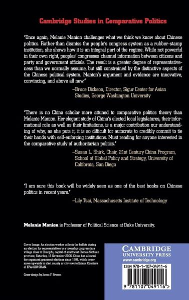 This book investigates the new representation unfolding in Chinese local congresses. Drawing qualitative fieldwork and data analysis from original surveys of 5,130 township, county, and municipal congressmen and women and constituents, Melanie Manion shows the priorities and problems of ordinary Chinese significantly influence both who gets elected to local congresses and what the congresses do once elected. Candidates nominated by ordinary voters are 'good types', with qualities that signal they will reliably represent the community. By contrast, candidates nominated by the communist party are 'governing types', with qualities that reflect officially valued competence and loyalty. However, congressmen and women of both types now largely reject the Maoist-era role of state agent. Instead, they view themselves as 'delegates', responsible for advocating with local government to supply local public goods. Manion argues that representation in Chinese local congresses taps local knowledge for local governance, thereby bolstering the rule of autocrats in Beijing.