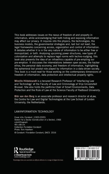 Part I: The Matrix of Information 1. Gary Marx, Genies: Bottled and Unbottled. Some Thoughts Properties of Information 2. Mireille Hildebrandt, Properties and property of information Part II: The Powers of Information 3. Julie Cohen, Between Truth and Power 4. Linnet Taylor, Data subjects or data citizens? Addressing the global regulatory challenge of big data Part III: What freedom of what information? 5. David Koepsell and Philip Serracino Inglott: ICT's Architecture of Freedom 6. Alexandra Couto, Justice, freedom of expression and copyright Part IV An infra-ethics for an information society? 7. Luciano Floridi, The Design of Infraethics 8. Bibi van den Berg, Coping with information overload and information underload: Hemming in freedom of information through decision support.