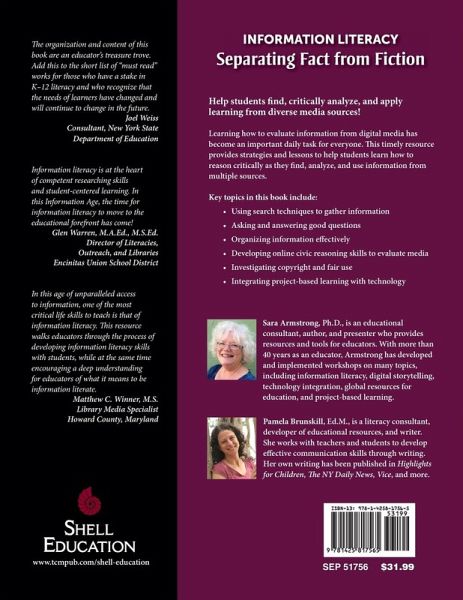 People today live in a world of information overload. Each day, information is shared from countless sources through numerous devices. Learning how to handle this onslaught of information has become a vital task for everyone. By the time they reach upper elementary school, most students are using smart phones, tablets and computers to access social media, video websites, online forums, wikis, blogs, and interactive digital games. Students need guidance on how to analyze online information sources, critically think about the content, and apply it to their decision-making. This essential professional resource includes everything that teachers need to help students achieve digital literacy, and includes activities and easy-to-use templates to support teachers as they teach the key skills of analyzing and understanding online information. This book by Sara Armstrong and Pamela Brunskill consists of three sections: Finding Information, Analyzing Information, and Using Information. The topics covered include: an introduction to information literacy; search techniques and strategies; asking and answering good questions; thinking visually; organizing information; online civic reasoning; analyzing online sources; using technology to teach; project-based learning with technology. With the amount of online information sources increasing exponentially, this book will equip teachers with the tools they need to help their students become global citizens and 21st century thinkers.