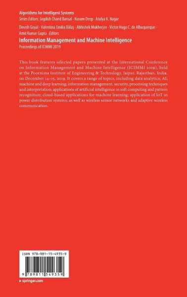 This book features selected papers presented at the International Conference on Information Management and Machine Intelligence (ICIMMI 2019), held at the Poornima Institute of Engineering & Technology, Jaipur, Rajasthan, India, on December 14-15, 2019. It covers a range of topics, including data analytics; AI; machine and deep learning; information management, security, processing techniques and interpretation; applications of artificial intelligence in soft computing and pattern recognition; cloud-based applications for machine learning; application of IoT in power distribution systems; as well as wireless sensor networks and adaptive wireless communication.