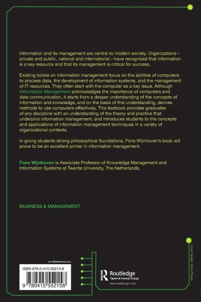 Information and its management is central to modern society. Organizations - private and public, national and international - have recognized that information is a key resource and that its management is critical for success. Existing books on information management focus on the abilities of computers to process data, the development of information systems, and the management of IT resources. They often start with the computer as a key issue. Although Information Management acknowledges the importance of computers and data communication, it starts from a deeper understanding of the concepts of information and knowledge, and on the basis of this understanding, derives methods to use computers effectively. This textbook provides graduates of any discipline with an understanding of the theory and practice that underpins information management, and introduces students to the concepts and applications of information management techniques in a variety of organizational contexts. In giving students strong philosophical foundations, Fons Wijnhoven's book will prove to be an excellent primer in information management.