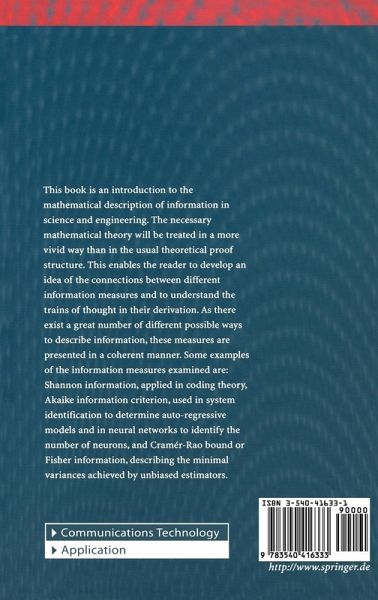 Abstract.- Structure and Structuring.- 1 Introduction.- Science and information.- Man as control loop.- Information, complexity and typical sequences.- Concepts of information.- Information, its technical dimension and the meaning of a message.- Information as a central concept.- 2 Basic considerations.- 2.1 Formal derivation of information.- 2.2 Application of the information measure (Shannon's information).- 2.3 The law of Weber and Fechner.- 2.4 Information of discrete random variables.- 3 Historic development of information theory.- 3.1 Development of information transmission.- 3.2 Development of information functions.- 4 The concept of entropy in physics.- The laws of thermodynamics:.- 4.1 Macroscopic entropy.- 4.2 Statistical entropy.- 4.3 Dynamic entropy.- 5 Extension of Shannon's information.- 5.1 Rényi's Information 1960.- 5.2 Another generalized entropy (logical expansion).- 5.3 Gain of information via conditional probabilities.- 5.4 Other entropy or information measures.- 6 Generalized entropy measures.- 6.1 The corresponding measures of divergence.- 6.2 Weighted entropies and expectation values of entropies.- 7 Information functions and gaussian distributions.- 7.1 Rényi's information of a gaussian distributed random variable.- 7.2 Shannon's information.- 8 Shannon's information of discrete probability distributions.- 8.1 Continuous and discrete random variables.- 8.2 Shannon's information of a gaussian distribution.- 8.3 Shannon's information as the possible gain of information in an observation.- 8.4 Limits of the information, limitations of the resolution.- 8.5 Maximization of the entropy of a continuous random variable.- 9 Information functions for gaussian distributions part II.- 9.1 Kullback's information.- 9.2 Kullback'sdivergence.- 9.3 Kolmogorov's information.- 9.4 Transformation of the coordinate system and the effects on the information.- 9.5 Transformation, discrete and continuous measures of entropy.- 9.6 Summary of the information functions.- 10 Bounds of the variance.- 10.1 Cramér-Rao bound.- 10.2 Chapman-Robbins bound.- 10.3 Bhattacharrya bound.- 10.4 Barankin bound.- 10.5 Other bounds.- 10.6 Summary.- 10.7 Biased estimator.- 11 Ambiguity function.- 11.1 The ambiguity function and Kullback's information.- 11.2 Connection between ambiguity function and Fisher's information.- 11.3 Maximum likelihood estimation and the ambiguity function.- 11.4 The ML estimation is asymptotically efficient.- 11.5 Transition to the Akaike information criterion.- 12 Akaike's information criterion.- 12.1 Akaike's information criterion and regression.- 12.2 BIC, SC or HQ.- 13 Channel information.- 13.1 Redundancy.- 13.2 Rate of transmission and equivocation.- 13.3 Hadamard's inequality and Gibbs's second theorem.- 13.4 Kolmogorov's information.- 13.5 Kullbacks divergence.- 13.6 An example of a transmission.- 13.7 Communication channel and information processing.- 13.8 Shannon's bound.- 13.9 Example of the channel capacity.- 14 'Deterministic' and stochastic information.- 14.1 Information in state space models.- 14.2 The observation equation.- 14.3 Transmission faster than light.- 14.4 Information about state space variables.- 15 Maximum entropy estimation.- 15.1 The difference between maximum entropy and minimum variance.- 15.2 The difference from bootstrap or resampling methods.- 15.3 A maximum entropy example.- 15.4 Maximum entropy: The method.- 15.5 Maximum entropy and minimum discrimination information.- 15.6 Generation of generalized entropy measures.- 16 Concludingremarks.- 16.1 Information, entropy and self-organization.- 16.2 Complexity theory.- 16.3 Data reduction.- 16.4 Cryptology.- 16.5 Concluding considerations.- 16.6 Information.- A.1 Inequality for Kullback's information.- A.2 The log-sum inequality.- A.3 Generalized entropy, divergence and distance measures.- A.3.1 Entropy measures.- A.3.2 Generalized measures of distance.- A.3.3 Generalized measures of the directed divergence.- A.3.4 Generalized measures of divergence.- A.3.4.1 Information radius and the J-divergence.- A.3.4.2 Generalization of the R-divergence.- A.3.4.3 Generalization of the J-divergence.- A.4 A short introduction to probability theory.- A.4.1 Axiomatic definition of probability.- A.4.1.1 Events, elementary events, sample space.- A.4.1.2 Classes of subsets, fields.- A.4.1.3 Axiomatic definition of probability according to Kolmogorov.- Probability space.- A.4.1.4 Random variables.- A.4.1.5 Probability distribution.- A.4.1.6 Probability space, sample space, realization space.- A.4.1.7 Probability distribution and distribution density function.- A.4.1.8 Probability distribution density function (PDF).- A.5 The regularity conditions.- A.6 State space description.