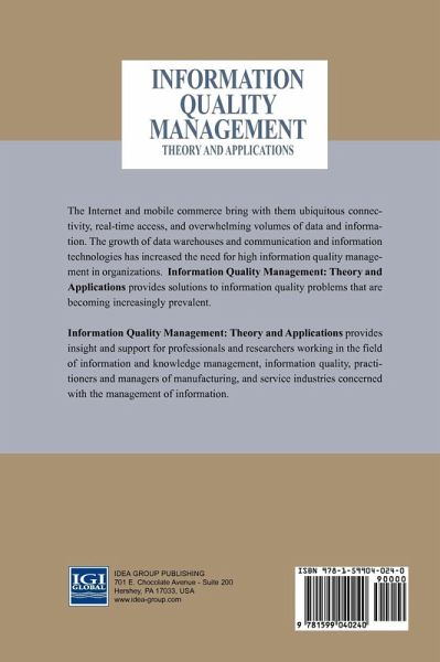 Technologies such as the Internet and mobile commerce bring with them ubiquitous connectivity, real-time access, and overwhelming volumes of data and information. The growth of data warehouses and communication and information technologies has increased the need for high information quality management in organizations. Information Quality Management: Theory and Applications provides solutions to information quality problems becoming increasingly prevalent.Information Quality Management: Theory and Applications provides insights and support for professionals and researchers working in the field of information and knowledge management, information quality, practitioners and managers of manufacturing, and service industries concerned with the management of information.
