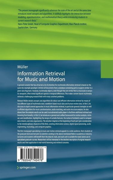 "Modern information society is experiencing an explosion of digital content, comprising text, speech, video and graphics. The challenge is to organize, understand, and search multimodal information in a robust, efficient and intelligent manner. The present monograph significantly advances the state of the art and introduces novel concepts and algorithms for content-based analysis and retrieval for music data (Part I) and motion data (Part II). Each part is suitable for use as stand-alone lecture notes for a graduate course in Computer Science. The monograph skillfully highlights the interaction between modeling, experimentation, and mathematical theory while introducing the students to current research fields." Hans-Peter Seidel, Head of Computer Graphics Department, Max-Planck-Institut, Saarbrücken, Germany "This book is a valuable contribution to the field. It introduces many new results in two upcoming areas within multimedia retrieval: audio and motion retrieval. In both parts of the book, efficiency and robustness are key issues, and indeed vital motivations in multimedia retrieval. The author has clearly established himself at thefrontier of the the research field in multimedia retrieval." Remco Veltkamp, U Utrecht, The Netherlands "This book addresses content-based multimedia retrieval for time-dependent media. Focusing on two example applications (music and human motion data), Müller first gives good introductions into these areas, accompanied by many illustrative examples, and then presents the results of his own research. Overall, this volume is a good introduction into and survey of current research in the area of multimedia retrieval." Norbert Fuhr, U Duisburg-Essen, Germany "The work of Meinard Müller on synchronization of static and dynamic data-types in music and motion occupies a unique place in the rapidly growing literature of interdisciplinary studies concerned with computer techniques in the arts. The Bonn mathematics group from which it issues enjoys its own special distinction in the development of rigorous applications with wide applicability." Eleanor Selfridge-Field, Stanford U, CA, USA "Information Retrieval for Music and Motion is an outstanding contribution to the analysis of music, motion, and gesture. This collection of state-of-the-art techniques is an essential reference for researchers in computer graphics, computer vision, computer music, and multimedia." Roger B. Dannenberg, School of Computer Science and School of Art, Carnegie Mellon University, Pittsburgh, PA, USA "...this work is an extremely comprehensive and empirical look at music and motion retrieval" from the ACM Reviews by Quinsulon Israel, Drexel University, USA