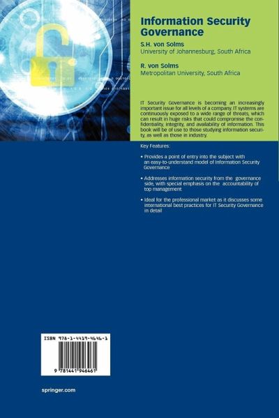 IT Security governance is becoming an increasingly important issue for all levels of a company. IT systems are continuously exposed to a wide range of threats, which can result in huge risks that threaten to compromise the confidentiality, integrity, and availability of information. This book will be of use to those studying information security, as well as those in industry.