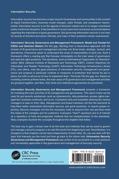 This book presents a framework to model the main activities of information security management and governance. The same model can be used for any security sub-domain such as cybersecurity, data protection, access rights management, business continuity, etc.