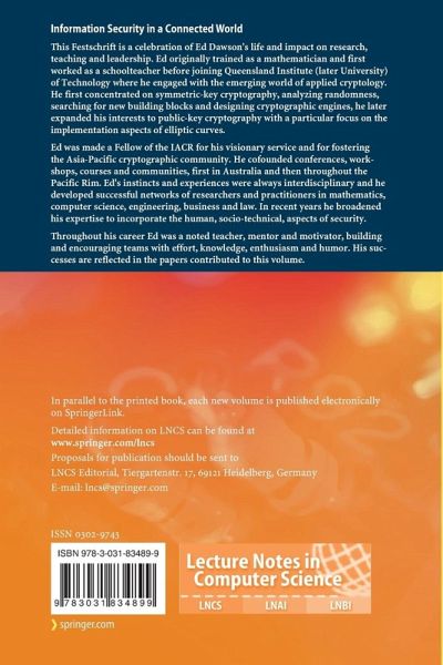 This Festschrift is a celebration of Ed Dawson's life and impact on research, teaching and leadership. Ed originally trained as a mathematician and first worked as a schoolteacher before joining Queensland Institute (later University) of Technology where he engaged with the emerging world of applied cryptology. He first concentrated on symmetric-key cryptography, analyzing randomness, searching for new building blocks and designing cryptographic engines, he later expanded his interests to public-key cryptography with a particular focus on the implementation aspects of elliptic curves.