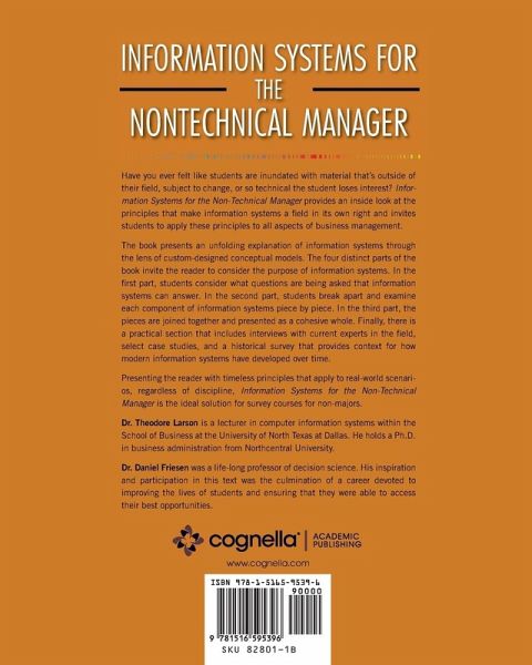 Have you ever felt like students are inundated with material that's outside of their field, subject to change, or so technical the student loses interest? Information Systems for the Non-Technical Manager provides an inside look at the principles that make information systems a field in its own right and invites students to apply these principles to all aspects of business management. The book presents an unfolding explanation of information systems through the lens of custom-designed conceptual models. The four distinct parts of the book invite the reader to consider the purpose of information systems. In the first part, students consider what questions are being asked that information systems can answer. In the second part, students break apart and examine each component of information systems piece by piece. In the third part, the pieces are joined together and presented as a cohesive whole. Finally, there is a practical section that includes interviews with current experts in the field, select case studies, and a historical survey that provides context for how modern information systems have developed over time. Presenting the reader with timeless principles that apply to real-world scenarios, regardless of discipline, Information Systems for the Non-Technical Manager is the ideal solution for survey courses for non-majors.
