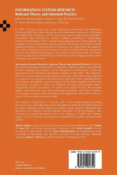 Information Systems Research: Relevant Theory and Informed Practice comprises the edited proceedings of the WG8.2 conference, "Relevant Theory and Informed Practice: Looking Forward from a 20-Year Perspective on IS Research," which was sponsored by IFIP and held in Manchester, England, in July 2004. The conference attracted a record number of high-quality manuscripts, all of which were subjected to a rigorous reviewing process in which four to eight track chairs, associate editors, and reviewers thoughtfully scrutinized papers by the highly regarded as well as the newcomers. No person or idea was considered sacrosanct and no paper made it through this process unscathed. All authors were asked to revise the accepted papers, some more than once; thus, good papers got better. With only 29 percent of the papers accepted, these proceedings are significantly more selective than is typical of many conference proceedings.
