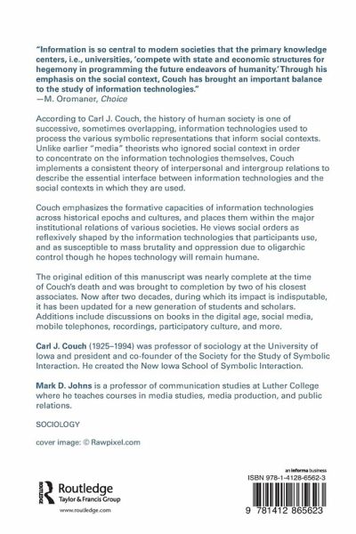 According to Carl J. Couch, the history of human society is one of successive, sometimes overlapping, information technologies used to process the various symbolic representations that inform social contexts. Unlike earlier "media" theorists who ignored social context in order to concentrate on the information technologies themselves, Couch implements a consistent theory of interpersonal and intergroup relations to describe the essential interface between information technologies and the social contexts in which they are used.