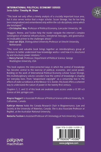 Introduction.- Part I Susan Strange and the Twenty-First Century Knowledge Structure.- Taking Knowledge Seriously: Towards an International Political Economy Theory of Knowledge Governance.- A Strange Approach to Information, Network, Sharing, and Platform Societies.- Reflection I.- Part II Internet Governance and Regulation.- Internet Infrastructure and the Persistent Myth of U.S. Hegemony.- Precarious Ownership of the Internet of Things in the Age of Data.- Reflection II.- Part III Questions of Truth and Censorship.- Weaponising Copyright: Cultural Governance and Regulating Speech in the Knowledge Economy.- Disinformation and Resistance in the Surveillance of Indigenous Protesters.- Reflection III.- Part IV Surveillance and Knowledge and/as Control.- Surveillance in the Name of Governance: Aadhaar as a Fix for Leaking Systems in India.- A Border Seeping in All Directions: Technologies of Separation Along the U.S.-Mexico Border in Ambos Nogales.- Reflection IV.- Conclusion: Looking Back, Looking Forward.