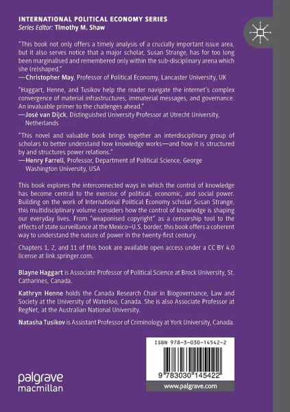 This book explores the interconnected ways in which the control of knowledge has become central to the exercise of political, economic, and social power. Building on the work of International Political Economy scholar Susan Strange, this multidisciplinary volume features experts from political science, anthropology, law, criminology, women's and gender studies, and Science and Technology Studies, who consider how the control of knowledge is shaping our everyday lives. From "weaponised copyright" as a censorship tool, to the battle over control of the internet's "guts," to the effects of state surveillance at the Mexico-U.S. border, this book offers a coherent way to understand the nature of power in the twenty-first century.