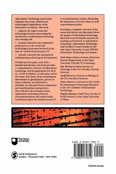 Introduction - Nick Heap PART ONE: DIFFERING PERSPECTIVES Introduction - Ray Thomas The Social Shaping of Technology - David Edge The Hacker Crackdown - Bruce Sterling Evolution of the US Telephone Network Theorising the IT/Society Relationship - Hugh Mackay The Roots of the Information Society Idea - David Lyon A Gendered Socio-Technical Construction - Anne-Jorun Berg The Smart House Access and Inequality - Ray Thomas PART TWO: IT IN THE WORKPLACE Introduction - Geoff Einon Robotics, Automation and a New Industrial Revolution - Paul Kennedy The Pursuit of Flexible Specialization in Britain and West Germany - Christel Lane Computerized Machine Tools, Manpower Consequences and Skill Utilization - Gert Hartmann, Ian Nicholas, Arndt Sorge and Malcolm Warner A Study of British and West German Manufacturing Firms Technological Change and the Future of Work - Peter Senker Technological Change at Work - Ian McLoughlin and Jon Clark PART THREE: IT AND LEARNING Introduction - Robin Mason Do Companies Need Technology-Based Training? - David Hawkridge Computer Supported Collaborative Learning - Anthony Kaye The Educational Value of ISDN - Robin Mason Access to Books for Visually Impaired Learners - Tom Vincent and Mary Taylor An Investigation into the Use of Compact Disc Technology (CD-ROM) Supporting Resource Based Learning - Josie Taylor and Diana Laurillard Constructivist Learning Theories and IT - Ann Jones PART FOUR: IT AND THE HOME Introduction - Hughie Mackay Conceptualizing Home Computing - Graham Murdock, Paul Hartmann and Peggy Gray Resources and Practices The Feminine Culture of the Telephone - Ann Moyal People, Patterns and Policy Patterns of Ownership of IT Devices in the Home - Hughie Mackay PART FIVE: IT FUTURES Introduction - Nick Heap Extra Terrestrial Relays - Arthur C Clarke Can Rockets Give World-Wide Radio Coverage? Iridium - Lawrence W Lockwood A High Flying Phone System No Silver Bullet - Frederick P Brooks, JR Essence and Accidents of Software Engineering There Is a Silver Bullet - Brad J Cox Virtual Reality in the Real World - Ralph Schroeder History, Applications and Projections Telework and the Changing Relation of Home and Work - Leslie Haddon and Roger Silverstone The New Space Race - David B Crosbie Satellite Mobile Communications