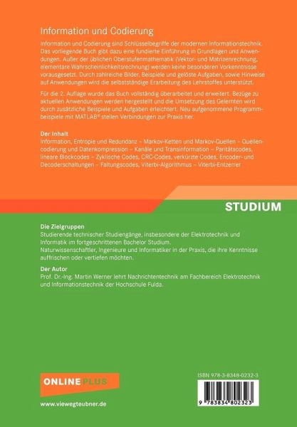 Information im technischen Sinne und ihr Schutz gegen Übertragungsfehler gehören heute zur Grundbildung von Ingenieuren und Informatikern. "Information und Codierung" will dazu wichtige Grundlagen und Methoden in kompakter Form vorstellen. Im ersten Teil steht der Begriff Information im Mittelpunkt. Der Ansatz, dass Information Ungewissheit auflöst, führt vom Zufallsexperiment zur Entropie. Informationsquellen werden zu Zufallsexperimenten und Information wird zur messbaren Größe. Wichtige Fragen zur Optimierung des Informationsflusses in technischen Systemen werden formuliert und - antwortet. Im zweiten Teil wird die Information durch die Kanalcodierung gegen Übertragungsfehler geschützt. Ohne Hinzufügen von Prüfzeichen wäre die Kommunikation mit Mobiltelefonen oder das Laden von Software für den PC über das Internet nicht denkbar. So werden fehl- hafte Daten im Empfänger erkannt und/oder korrigiert. Beide Teile sind so organisiert, dass sie unabhängig voneinander gelesen werdenkönnen. Das Buch begleitet eine vierstündige Lehrveranstaltung an der Hochschule Fulda im vierten Fachsemester des Bachelor-Studienganges Elektrotechnik und Informationstechnik. Viele Jahre Erfahrung in der Lehre zeigen, dass sich die Studierenden in die zunächst ungewohnte Art des Stoffes hineindenken müssen. Ist die Hürde erst mal genommen, fallen die weiteren Schritte leichter. Allen Leserinnen und Lesern wünsche ich deshalb ein offenes Herangehen an "Information und Codierung".
