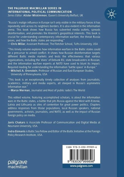 Chapter 1: Introduction.- Part I: The Weight of History.- Chapter 2: Echoes of the Past: Media and History in the Baltic Battlespace.- Chapter 3: Russian Disinformation: The Forest Brothers, Baltic Resistance, and NATO.- Part II: The Weight of Ethnicity.- Chapter 4: Making Sense of Public Media in Times of Geo-Political Crisis: Latvian Public Media and their Ethno-Linguistic Majority and Minority Audiences.- Chapter 5: Building Bridges: Estonian- and Russian-Speaking TV Audiences and the Value of Estonian Public Service Broadcasting, 2010-2020.-Chapter 6: Building or Banning? Russian-Language TV in Latvia.- Part III: The Digital Challenges.- Chapter 7: Bots, Trolls, Elves, and the Information War in Lithuania: Theoretical Considerations and Practical Problems.- Chapter 8: Robotrolling in the Baltic States.- Part IV: The Responses,- Chapter 9: Disinformation Analysis and Citizen Activism in the "Post-Truth" Era: The Case of DebunkEU.org.- Chapter 10: The Perils of Defense in an Information War: Media, Minorities, and the Threat Next Door.- Chapter 11: NATO's Response to Information Warfare Threats.- Part V: The Complications.- Chapter 12: "Let Them Flee to Sweden: There, Everyone Looks at Them More Politely": Gay Propaganda and LGBT Rights in the Baltic States.- Chapter 13: The Best of Enemies: Identity, Recursion, and the Convergence of Kremlin and Estonian Strategic Narratives in the Global Populist Discourse.- Part VI: Epilogue.- Chapter 14: Epilogue: Baltic Journalists Respond to Disinformation.