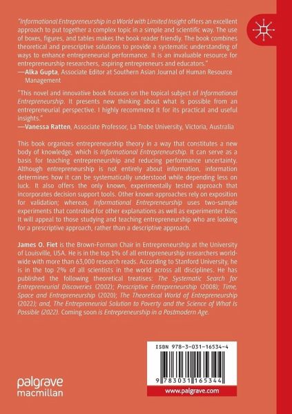 This book organizes entrepreneurship theory in a way that constitutes a new body of knowledge, which is Informational Entrepreneurship. It can serve as a basis for teaching entrepreneurship and reducing performance uncertainty. Although entrepreneurship is not entirely about information, information determines how it can be systematically understood while depending less on luck. It also offers the only known, experimentally tested approach that incorporates decision support tools. Other known approaches rely on exposition for validation; whereas, Informational Entrepreneurship uses two-sample experiments that controlled for other explanations as well as experimenter bias. It will appeal to those studying and teaching entrepreneurship who are looking for a prescriptive approach, rather than a descriptive approach.