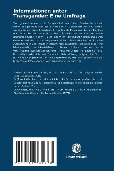 Transgender-Personen - die Gemeinschaft des dritten Geschlechts - sind schon seit Jahrhunderten Teil der indischen Gesellschaft. Vor 400 Jahren wurden sie als Hijras bezeichnet. Sie galten als Menschen, die ihre Identität und ihren Respekt verloren hatten, die verachtet wurden und einen geringeren Status hatten. Heute jedoch hat die indische Regierung durch Gesetze und Rechte die Möglichkeit eines dritten Geschlechts in allen Aufzeichnungen und offiziellen Dokumenten geschaffen. Die einst sozial und bildungsmäßig zurückgebliebenen Bürger Indiens werden durch verschiedene Wohlfahrtsprogramme, Reservierungen im Bildungs- und Beschäftigungsbereich und finanzielle Unterstützung aufgewertet. Dieses Buch hat einen positiven Versuch unternommen, das Bewusstsein und die Nutzung von Informationen unter Transgender zu ermitteln.