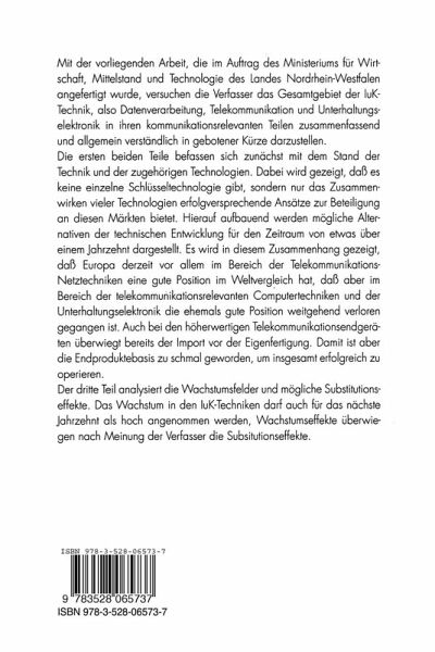 1. Stand der Technik.- 1.1 Schlüsseltechnologien für die IuK-Techniken.- 1.1.0 Vorbemerkung.- 1.1.1 Mikroelektronik.- 1.1.2 Ein- und Ausgabetechnologien.- 1.1.2.1 Displays für die flüchtige Darstellung.- 1.1.2.2 Massenspeichersysteme.- 1.1.2.3 Schreibende Ausgabegeräte.- 1.1.2.4 Lesende Eingabegeräte.- 1.1.2.5 Tastaturen, Mäuse und Digitizer.- 1.1.3 Optische Informationstechnologien.- 1.1.3.1 Glasfasertechnik.- 1.1.3.2 Optische Informationsverarbeitung.- 1.1.4 Softwaretechnik.- 1.1.4.0 Vorbemerkung.- 1.1.4.1 Einsatz von Software in der Vermittlungstechnik.- 1.1.4.2 Kommunikationssoftware für Endgeräte.- 1.1.5 Zusammenfassende Feststellungen und Hypothesen.- 1.2 Einführung von ISDN.- 1.2.1 Rückblick.- 1.2.2 Das ISDN-Konzept.- 1.2.3 Einführungsstrategie und Stand der Einführung.- 1.2.4 Zusammenfassende Feststellungen und Bewertungen.- 1.3 Lokale Netze.- 1.3.1 Konzepte für Lokale Netze.- 1.3.2 Stand der Einführung.- 1.3.3 Zusammenfassende Feststellungen.- 1.4 Optische Informationstechnik.- 1.4.1 Optische Übermittlung.- 1.4.2 Stand der Glasfasertechnik.- 1.4.3 Zusammenfassende Feststellungen.- 1.5 Satellitenfunk.- 1.5.1 Rückblick.- 1.5.2 Stand der Satellitentechnik.- 1.5.3 Zusammenfassende Feststellungen.- 1.6 Mobilfunk.- 1.6.1 Rückblick.- 1.6.2 Stand der Technik.- 1.6.3 Zusammenfassende Feststellungen.- 1.7 Intelligente Netze.- 1.7.1 Rückblick.- 1.7.2 Stand der Entwicklung.- 1.7.3 Zusammenfassende Feststellungen.- 1.8 Breitbandige Netze.- 1.8.1 Rückblick.- 1.8.2 Stand der Technik.- 1.8.3 Zusammenfassende Feststellungen.- 1.9 Dienste und Endgeräte.- 1.9.1 Rückblick.- 1.9.1.0 Vorbemerkung.- 1.9.1.1 Individualdienste.- 1.9.1.2 Rundfunkdienste.- 1.9.2 Diensteklassen und ihre Bedeutung.- 1.9.3 Einführung und Stand von Fernmeldediensten.- 1.9.3.1 Individualdienste.- 1.9.3.2 Rundfunkdienste.- 1.9.4 Endgeräte.- 1.9.4.1 Endgeräte für Individualdienste.- 1.9.4.2 Endgeräte für Rundfunkdienste.- 1.9.5 Zusammenfassende Feststellungen.- 1.10 Dienste-Verflechtung.- 1.10.1 Rückblick.- 1.10.2 Stand der Entwicklung.- 1.10.3 Zusammenfassende Feststellungen.- 2. Alternative Entwicklungsmöglichkeiten der IuK-Techniken.- 2.0 Allgemeine Vorbemerkungen.- 2.0.1 Ausgangssituation.- 2.1 Schlüsseltechnologien für die IuK-Techniken.- 2.1.1 Mikroelektronik.- 2.1.2 Ein- und Ausgabetechniken.- 2.1.2.0 Vorbemerkung.- 2.1.2.1 Displays für die flüchtige Darstellung.- 2.1.2.2 Massenspeichersysteme.- 2.1.2.3 Schreibende Ausgabegeräte.- 2.1.2.4 Lesende Eingabegeräte.- 2.1.2.5 Tastaturen, Mäuse und Digitizer.- 2.1.3 Optische Informationstechnologien.- 2.1.3.1 Glasfasertechnik.- 2.1.3.2 Optische Informationsverarbeitung.- 2.1.4 Softwaretechnik.- 2.1.4.0 Vorbemerkung.- 2.1.4.1 Einsatz von Software in der Vermittlungstechnik.- 2.1.4.2 Kommunikationssoftware für Endgeräte.- 2.1.5. Synergienutzung.- 2.1.6 Zusammenfassende Hypothesen und Bewertungen.- 2.2 Alternativen zum und innerhalb des ISDN.- 2.2.0 Vorbemerkung.- 2.2.1 Alternativen zum gewählten ISDN-Konzept.- 2.2.2 Die Schnittstellenproblematik.- 2.2.3 Zusammenfassende Bewertungen und Empfehlungen.- 2.3 Alternativen bei Lokalen Netzen.- 2.3.1 Weiterentwicklung der LAN-Technik.- 2.3.2 Verbindung von LANs untereinander.- 2.3.3 Zusammenfassende Bewertungen.- 2.4 Weiterentwicklung der optischen Nachrichtentechnik.- 2.4.1 Randbedingung für die Weiterentwicklung.- 2.4.2 Technische Gestaltungsmöglichkeiten.- 2.4.3 Zusammenfassende Bewertungen.- 2.5 Weiterentwicklung beim Satellitenfunk.- 2.5.1 Technische Weiterentwicklung bei den Raumsegmenten.- 2.5.2 Zusammenfassende Hypothesen und Bewertungen.- 2.6 Weiterentwicklung im Mobilfunk.- 2.6.1 Absehbare Konzepte im Mobilfunk.- 2.6.2 Technische Weiterentwicklung bei den Mobilfunksystemen.- 2.6.3 Konkurrenz zwischen drahtgebundener und drahtloser Individualkommunikation.- 2.6.4 Zusammenfassende Hypothesen und Bewertungen.- 2.7 Weiterentwicklung bei den Intelligenten Netzen.- 2.7.0 Vorbemerkung.- 2.7.1 Fortentwicklung bei Normen und Standardi