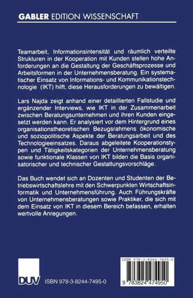 Lars Najda zeigt anhand einer detaillierten Fallstudie und ergänzender Interviews wie IKT in der Zusammenarbeit zwischen Beratungsunternehmen und ihren Kunden eingesetzt werden kann. Er analysiert vor dem Hintergrund eines organisationstheoretischen Bezugsrahmens ökonomische und soziopolitische Aspekte der Beratungsarbeit und des Technologieeinsatzes. Daraus abgeleitete Kooperationstypen und Tätigkeitskategorien der Unternehmensberatung sowie funktionale Klassen von IKT bilden die Basis organisatorischer und technischer Gestaltungsvorschläge.