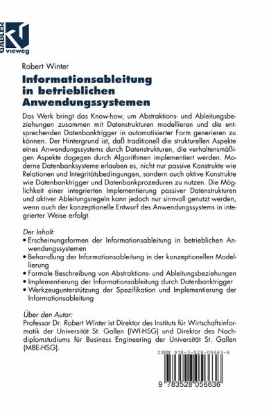 1 Einführung.- 1.1 Untersuchungsgegenstand und Untersuchungsziele.- 1.2 Stand der Forschung.- 1.3 Begriffsdefinitionen.- 2 Informationsableitung in Betrieblichen Anwendungssystemen.- 2.1 Erscheinungsformen der Informationsableitung.- 2.2 Konzeptionelle Modellierung und Implementierung der Informationsableitung.- 2.3 Konsequenzen der Informationsableitung für die Systementwicklung.- 3 Konzeptionelle Modellierung Betrieblicher Anwendungssysteme.- 3.1 Entity Relationship-Modell.- 3.2 Erweiterungen des ER-Modells zur Repräsentation von Abstraktion.- 3.3 Vom erweiterten Entity-Relationship-Modell zum Objekttypenmodell.- 3.4 Strukturiertes Entity-Relationship-Modell.- 3.5 Erweiterungen des Objekttypenmodells für die Informationsableitung.- 4 Formalisierung und Implementierung Erweiterter Konzeptioneller Modelle.- 4.1 Formale Beschreibung des erweiterten Objekttypenmodells.- 4.2 Implementierung formalisierter, erweiterter Objekttypenschemata.- 4.3 Erweiterung des Konzepts auf mehrstufige Propagierungen bzw. Prüfungen.- 4.4 Unterstützung der Entwicklung erweiterter Objekttypenschemata.- 5 Zusammenfassung und Diskussion.- 5.1 Zusammenfassung der Ergebnisse.- 5.2 Einschränkungen und Probleme.- 5.3 Diskussion.