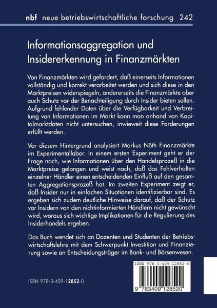 Von Finanzmärkten wird gefordert, daß sich einerseits Informationen in den Marktpreisen widerspiegeln, andererseits Finanzmärkte Schutz vor Insidern bieten. Aufgrund fehlender Daten über die Verfügbarkeit und Verbreitung von Informationen im Markt kann man anhand von Kapitalmarktdaten nicht untersuchen, inwieweit diese Forderungen erfüllt werden. Der Autor analysiert daher Finanzmärkte im Experimentallabor. Im ersten Experiment prüft er, wie Informationen in die Marktpreise gelangen und weist nach, daß das Fehlverhalten einzelner Händler einen Einfluß auf den Aggregationsprozeß hat. Im zweiten Experiment zeigt er, daß Insider nur in einfachen Situationen identifizierbar sind. Verzeichnis: Der Autor analysiert Finanzmärkte im Experimentallabor. Er prüft wie Informationen in die Marktpreise gelangen und weist nach, daß das Fehlverhalten einzelner Händler einen Einfluß auf den Aggregationsprozeß hat. Außerdem zeigt er, daß Insider nur in einfachen Situationen identifizierbar sind. Daraus ergeben sich wichtige Implikationen für die Regulierung des Insiderhandels.