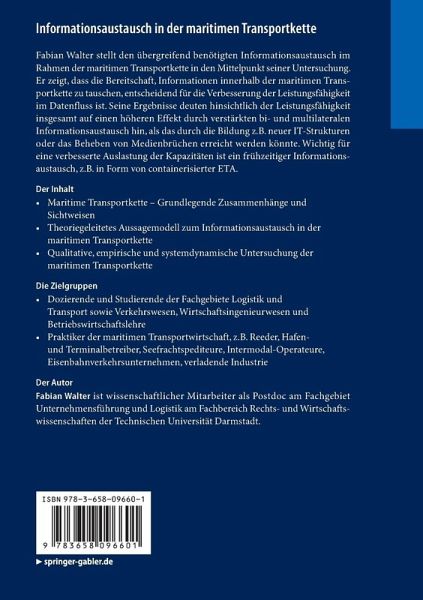 Fabian Walter stellt den übergreifend benötigten Informationsaustausch im Rahmen der maritimen Transportkette in den Mittelpunkt seiner Untersuchung. Er zeigt, dass die Bereitschaft, Informationen innerhalb der maritimen Transportkette zu tauschen, entscheidend für die Verbesserung der Leistungsfähigkeit im Datenfluss ist. Seine Ergebnisse deuten hinsichtlich der Leistungsfähigkeit insgesamt auf einen höheren Effekt durch verstärkten bi¿ und multilateralen Informationsaustausch hin, als das durch die Bildung z.B. neuer IT¿Strukturen oder das Beheben von Medienbrüchen erreicht werden könnte. Wichtig für eine verbesserte Auslastung der Kapazitäten ist ein frühzeitiger Informationsaustausch, z.B. in Form von containerisierter ETA.
