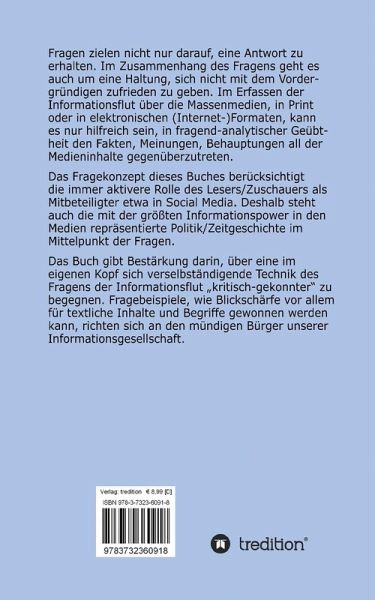eigenen Kopf sich verselbständigende Technik des Fragens der Informationsflut "kritisch-gekonnter" zu begegnen. Fragebeispiele, wie Blickschärfe vor allem für textliche Inhalte und Begriffe gewonnen werden kann, richten sich an den mündigen Bürger unserer Informationsgesellschaft.