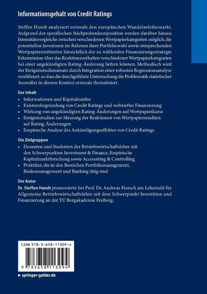 Steffen Hundt analysiert erstmals den europäischen Wandelanleihemarkt. Aufgrund der spezifischen Stichprobenkomposition werden darüber hinaus Intensitätsvergleiche zwischen verschiedenen Wertpapierkategorien möglich, die potentiellen Investoren im Rahmen ihrer Portfoliowahl sowie entsprechenden Wertpapieremittenten hinsichtlich der zu wählenden Finanzierungsstrategie Erkenntnisse über das Reaktionsverhalten verschiedener Wertpapierkategorien bei einer angekündigten Rating-Änderung liefern können. Methodisch wird der Ereignisstudienansatz durch Integration einer robusten Regressionsanalyse modifiziert, so dass die durchgeführte Untersuchung die Problematik statistischer Ausreißer in diesem Kontext erstmals thematisiert.
