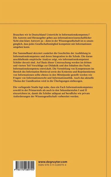 Der Sammelband skizziert zunächst die Geschichte der Ausbildung in Informationskompetenz und deren Integration in die Schule. Die daran anschließende empirische Analyse zeigt, wie informationskompetent Schüler derzeit sind. Auf Basis dieser Untersuchung werden im dritten und vierten Teil Vorschläge zur Didaktik und den Inhalten des Fachs Informationskompetenz entwickelt. Die Vermittlung von Kompetenzen im Bereich des Information Retrieval sowie des Kreierens und Repräsentierens von Informationen sollte ebenso in den Mittelpunkt gestellt werden wie Fragen von Informationsrecht und Informationsethik. Auch das aktuelle Thema der Gamification wird in die Überlegungen einbezogen.