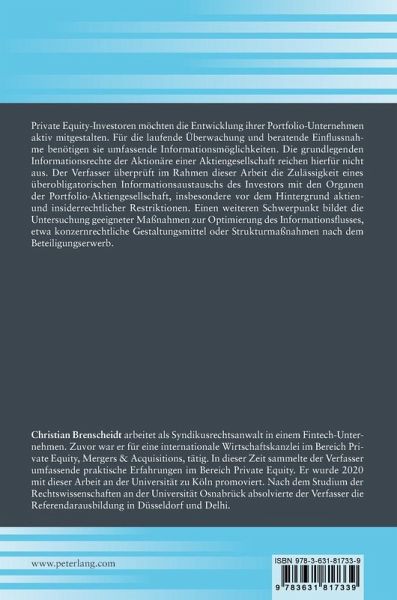 Christian Brenscheidt arbeitet als Syndikusrechtsanwalt in einem Fintech-Unternehmen. Zuvor war er für eine internationale Wirtschaftskanzlei im Bereich Private Equity, Mergers & Acquisitions, tätig. In dieser Zeit sammelte der Verfasser umfassende praktische Erfahrungen im Bereich Private Equity. Er wurde 2020 mit dieser Arbeit an der Universität zu Köln promoviert. Nach dem Studium der Rechtswissenschaften an der Universität Osnabrück absolvierte der Verfasser die Referendarausbildung in Düsseldorf und Delhi.
