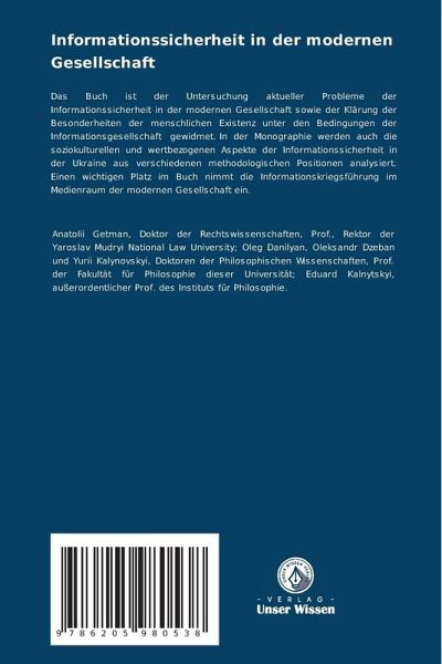 Das Buch ist der Untersuchung aktueller Probleme der Informationssicherheit in der modernen Gesellschaft sowie der Klärung der Besonderheiten der menschlichen Existenz unter den Bedingungen der Informationsgesellschaft gewidmet. In der Monographie werden auch die soziokulturellen und wertbezogenen Aspekte der Informationssicherheit in der Ukraine aus verschiedenen methodologischen Positionen analysiert. Einen wichtigen Platz im Buch nimmt die Informationskriegsführung im Medienraum der modernen Gesellschaft ein.