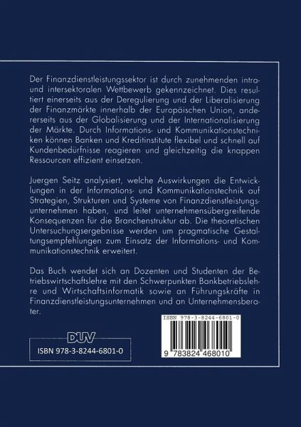 Der Finanzdienstleistungssektor ist durch zunehmenden intra- und intersektoralen Wettbewerb gekennzeichnet. Dies resultiert einerseits aus der Deregulierung und der Liberalisierung der Finanzmärkte innerhalb der Europäischen Union, andererseits aus der Globalisierung und der Internationalisierung der Märkte. Durch Informations- und Kommunikationstechniken können Banken und Kreditinstitute flexibel und schnell auf Kundenbedürfnisse reagieren und gleichzeitig die knappen Ressourcen effizient einsetzen. Juergen Seitz analysiert, welche Auswirkungen die Entwicklungen in der Informations- und Kommunikationstechnik auf Strategien, Strukturen und Systeme von Finanzdienstleistungsunternehmen haben, und leitet unternehmensübergreifende Konsequenzen für die Branchenstruktur ab. Die theoretischen Untersuchungsergebnisse werden um pragmatische Gestaltungsempfehlungen zum Einsatz der Informations- und Kommunikationstechnik erweitert.